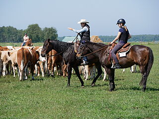 Neben der intensiven Rinderarbeit kam auch das Training auf dem großen Außenreitplatz nicht zu kurz. Die Teilnehmenden konnten sowohl an Basismanövern als auch an der Cuttingmaschine ihre Fähigkeiten weiterentwickeln.